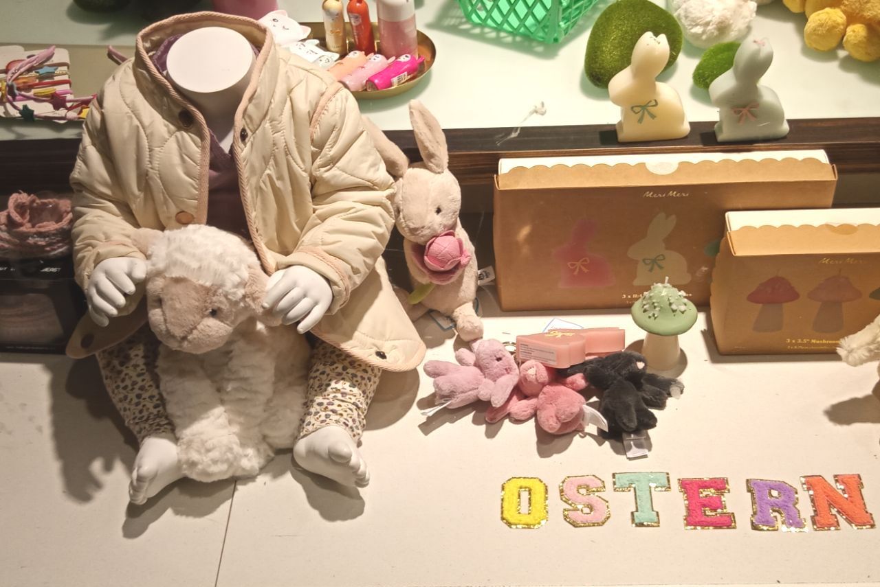 Geköpftes Kind im Schaufenster. Kopflos mit Lämmchen. Zu Ostern.